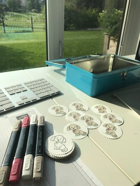 Isn't this card adorable?! It was created with the stamp set, Bella and Friends. I offered to help Lynsay by punching out the circles with the Starburst punch and then stamping and coloring the dog with Stampin' Blends.