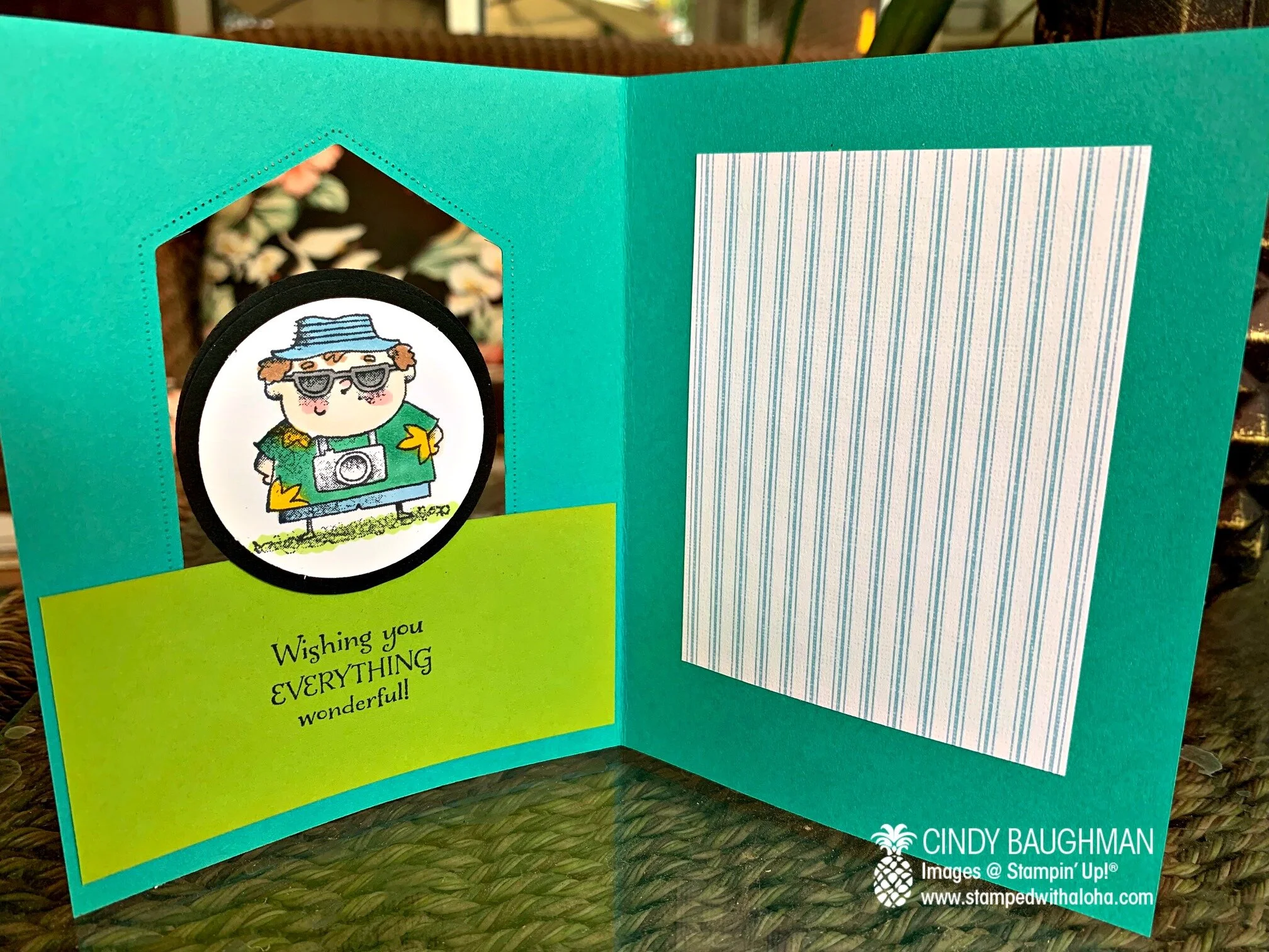 I created this “inside outside panel card” that highlighted two of my favorite images from this adorable stamp set. To create this type of card, you create a window in the card and put a piece of card stock in it that is stamped on both sides. Here is what the card looks like on the inside.