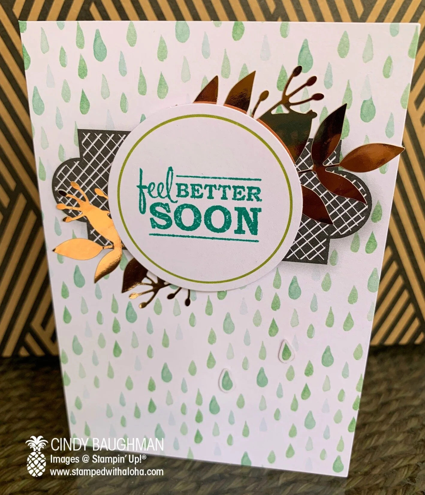 This card has a really pretty shiny piece with leaves that frames the circle with the sentiment, “Feel Better Soon”. I know receiving a pretty card like this did make me feel better!