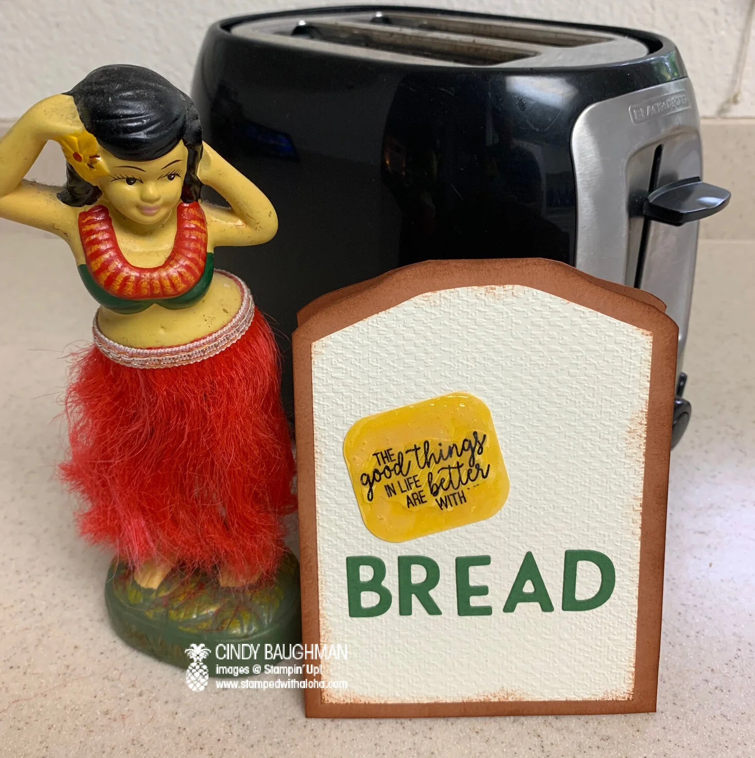 For the pat of butter, I stamped a small piece of Daffodil Delight Card Stock with an image from the Butterfly Gala stamp set. I fussy cut the sentiment out omitting the word “you”. I then layered it onto a piece of Daffodil Delight Card Stock that I had cut into a small rectangle and rounded the corners with the Detailed Trio Punch. I covered this whole piece with Shimmery Crystal Effects, after adhering it to the front of the card. The word “bread” was die cut out of Garden Green Card Stock using the Playful Alphabet Dies.