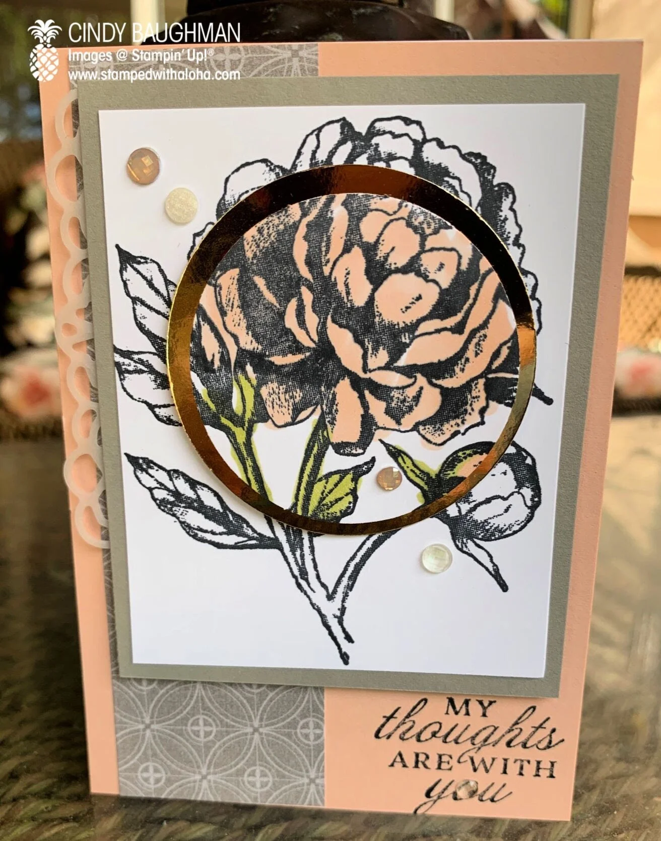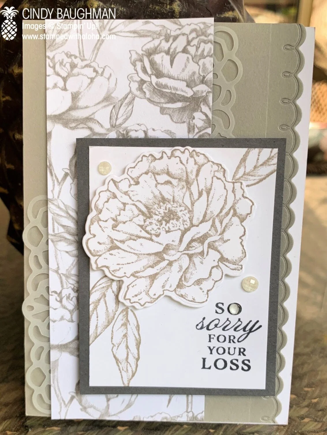 The next card is a monochromatic sympathy card. The designer paper is so gorgeous and it coordinates perfectly with this image from the Prized Peony stamp set.