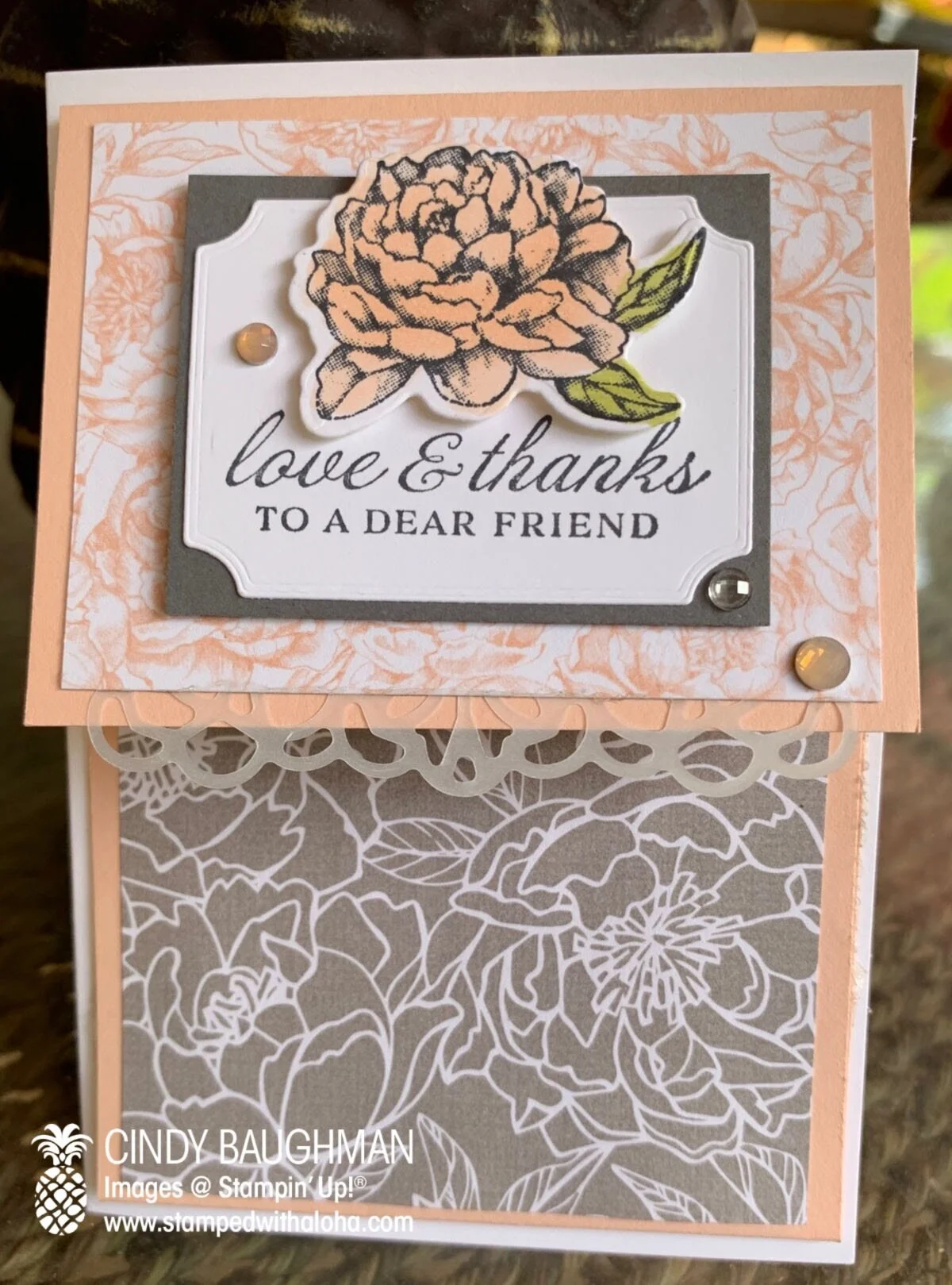 Each project in this series uses the following coordinating products, the Peony Garden Designer Series Paper, Elegant Faceted Gems, Square Vellum Doilies and the Prized Peony Bundle.