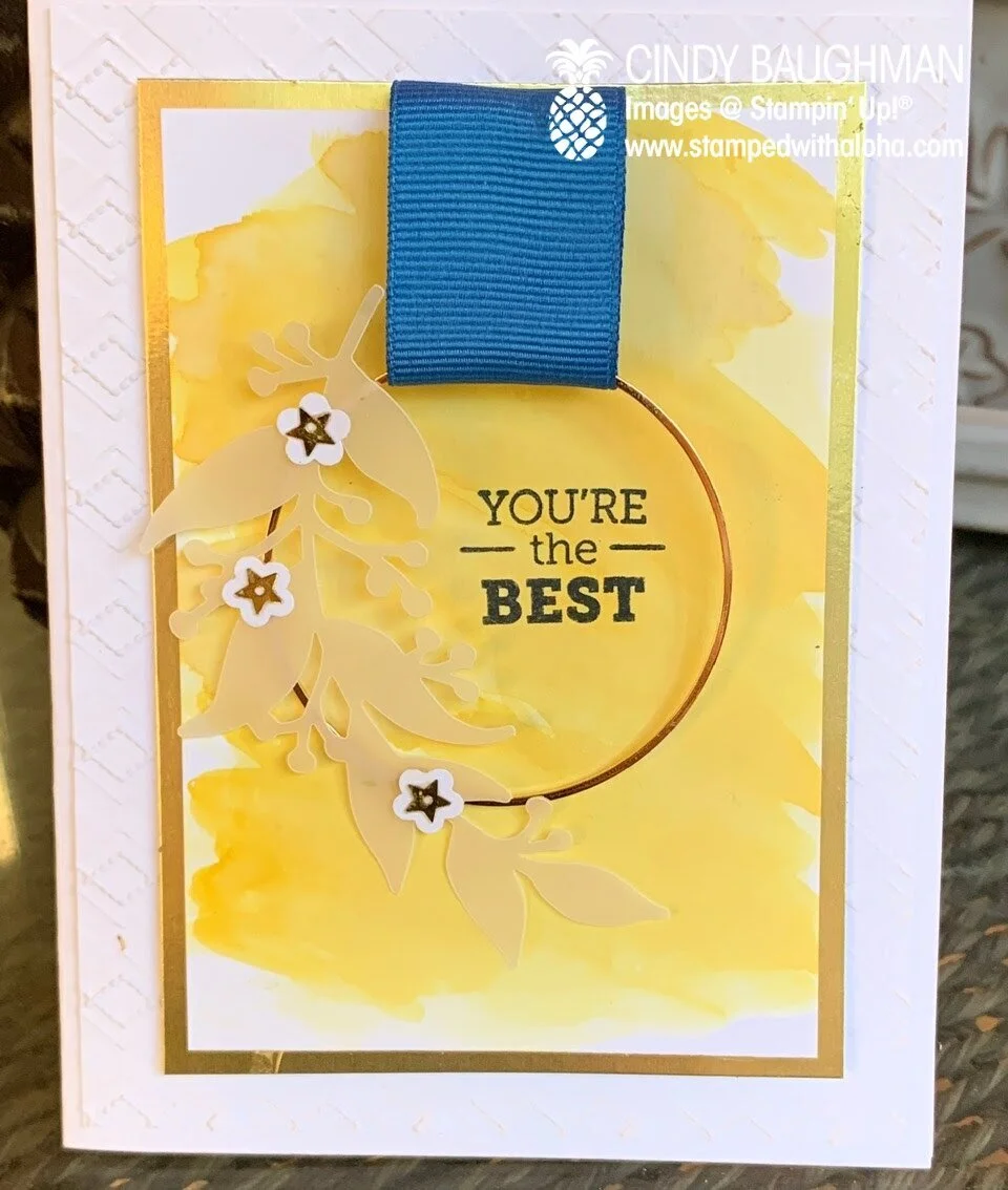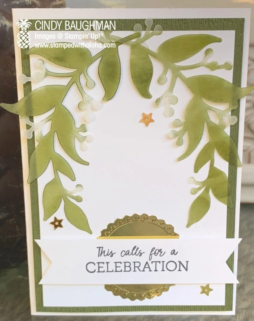 As I worked with the leaves they reminded me of a maile lei. So, I took two leaves and I sponged them with Old Olive Ink using a Sponge Dauber. I put them together to form a lei and added an appropriate celebratory sentiment to the bottom.