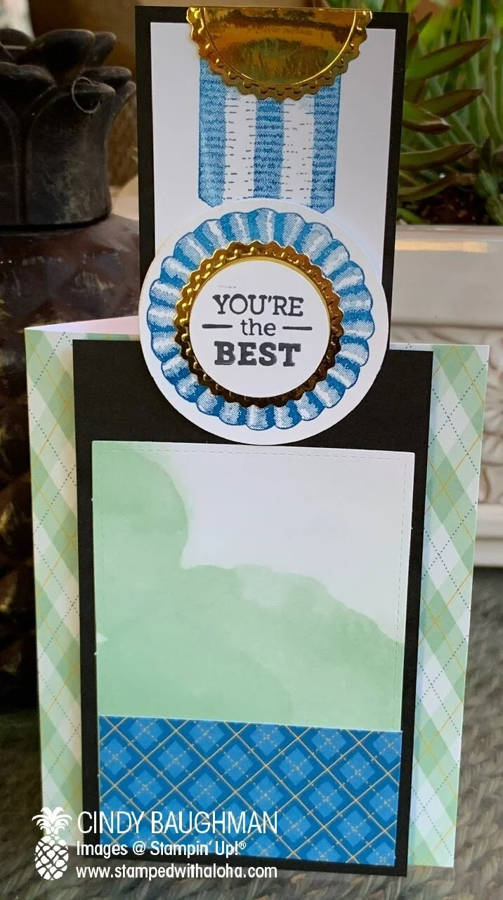 Below is the alternative easel card I created to celebrate teachers! To create this card I scored the front panel of the card base at 2 1/8 inches. The 3 x 3 1/4 Blue Argyle rectangle that the trophy is attached to was cut from a card base in the kit.