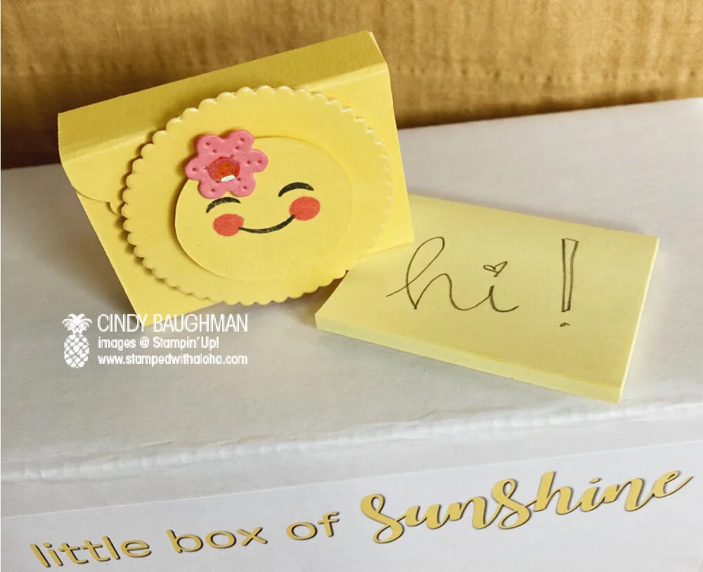 All I did to feature Cindy’s cookie was to place it in one of our 3 1/8 x 3 1/8 Acetate Boxes and wrap it with a simple belly band. I used two images from the Sharing Sunshine stamp set to add a decorative pattern on the band. I love collaborating with Cindy and think she did such an amazing job on this cookie!