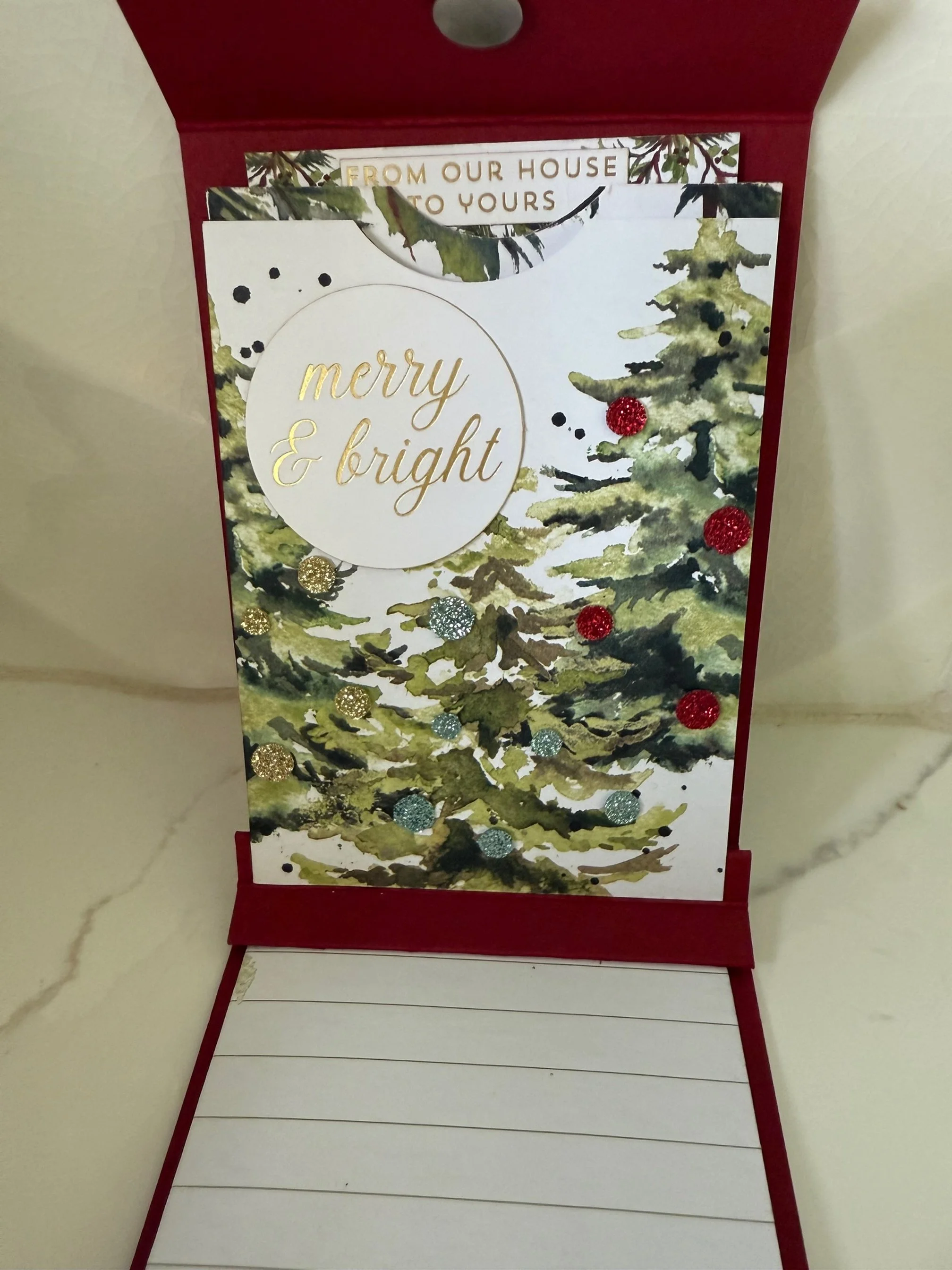The video tutorial shows how to embellish each pocket with themed ephemera – "Tis the Season," "Merry and Bright," and "From Our House to Yours" – creating a cohesive holiday theme. Sparkling sequins add just the right amount of festive sparkle, while a strong magnet provides a secure closure for the top flap.