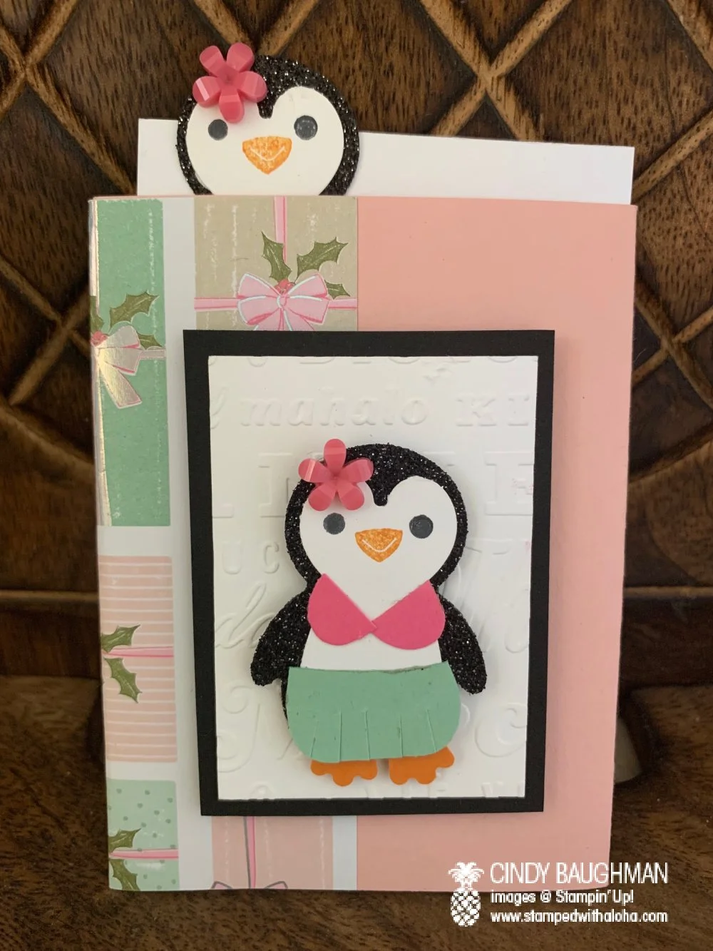Did you notice how we strategically embossed the word “mahalo” on this project? We did that using the fabulous Thanks and Hello Embossing Folders. These penguins, like the ornament above were punched out of Black Glimmer Paper which makes them extra sparkly and fun.