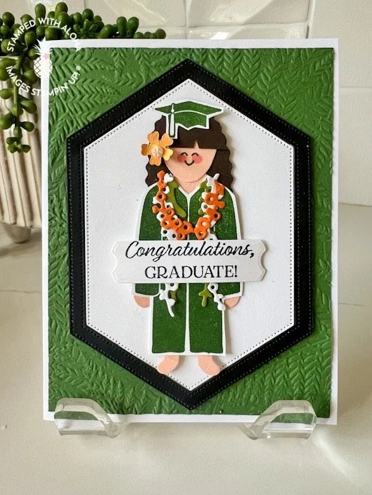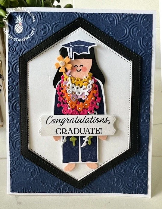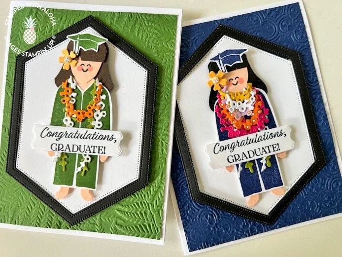 All of these cards were made using the Stampin’ Up! Cap and Gown stamp set which is an online exclusive. When I created my prototype card for a University of Hawaii graduate, I used the Double Oval punch for her face, hair, and body. Here is how the card came out.